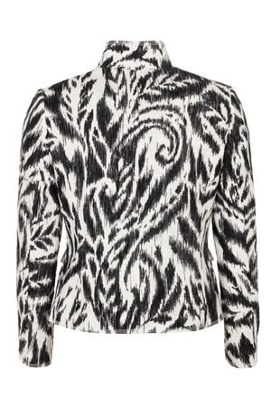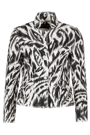 The Joanie blazer combines timeless tailoring with contemporary edge. Crafted from a cotton-viscose blend, this black style features seven buttons, two patch pockets, and a striking stand collar. The graphic black and white design adds visual interest, while the lined interior ensures comfort and structure. A versatile piece that transitions effortlessly from office to evening wear.